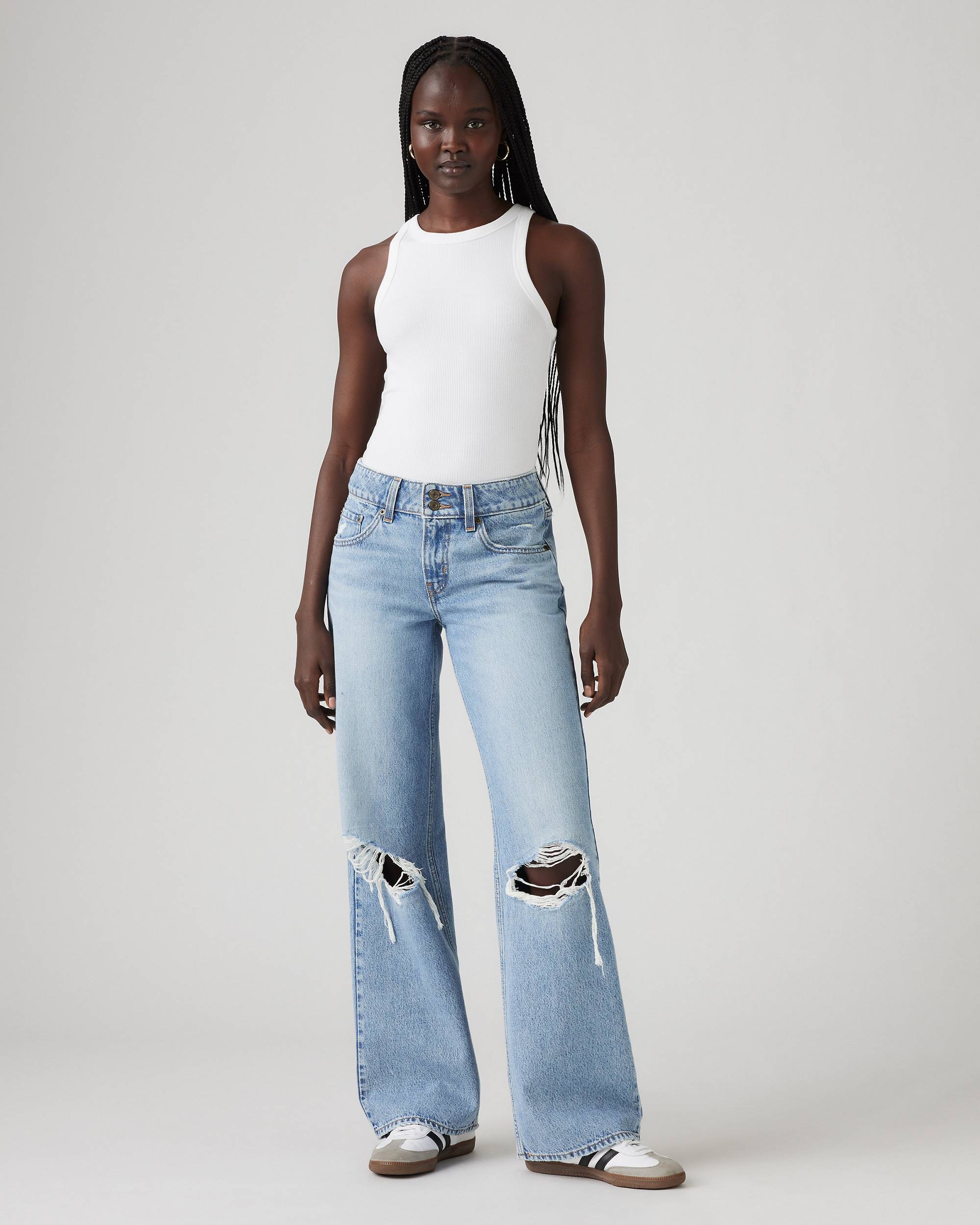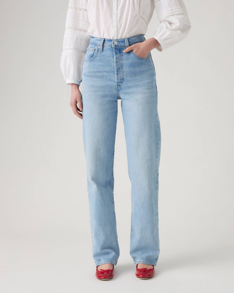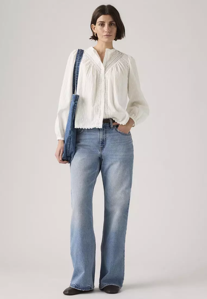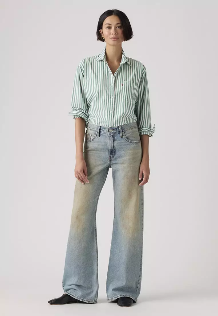 ROSÉ 在形象企劃中身穿 Levi’s® 寬鬆靴型丹寧褲(Loose Boot),以復古與現代交融的設計語言,打造出極具時髦感的輪廓。中腰剪裁自然拉出比例,寬鬆版型配合微喇褲管線條,讓雙腿視覺上被延伸,整體造型既隨性又俐落。
