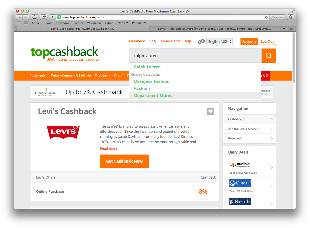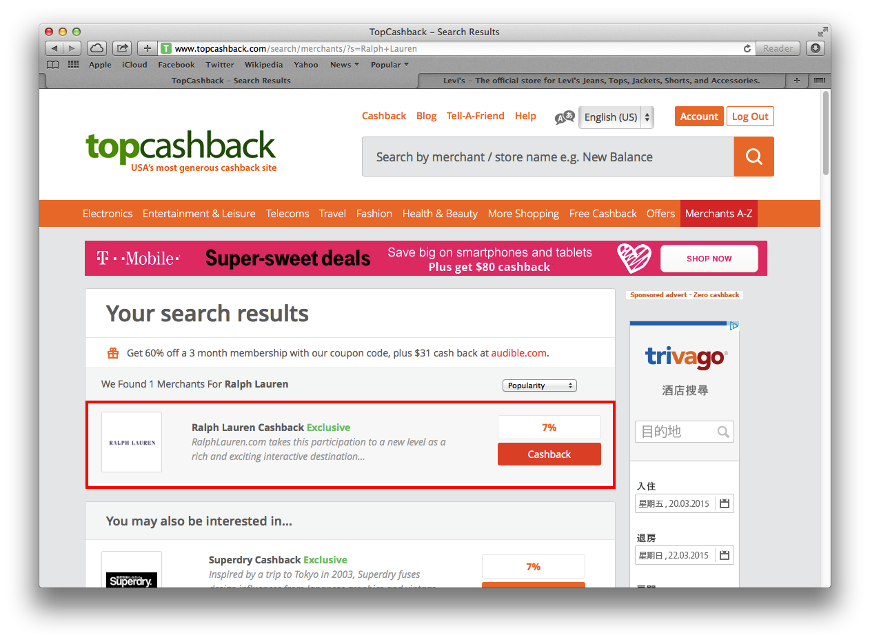 成功登記後,登入 Topcashback,開始搜尋你的目標商店,如 Ralph Lauren。(按下圖可放大)