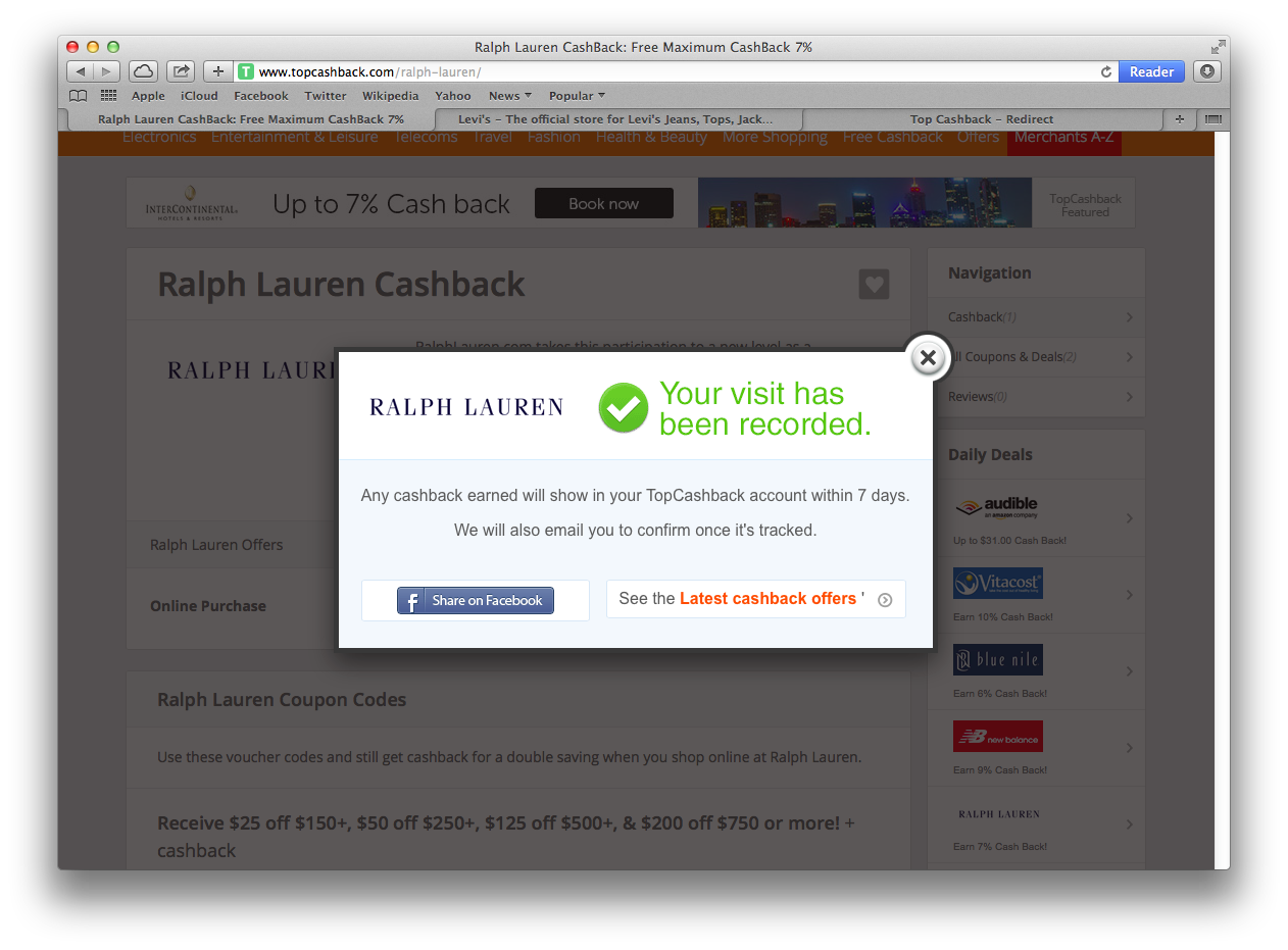 按下「Get Cashback Now」即可在新視窗中到商店購物(而本身的 Topcashback 則會出現 「Your visit has been recorded」)