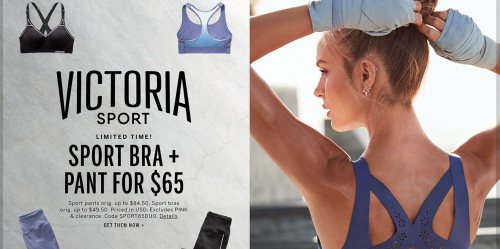 For a limited time only! Complete your gym attire with Victoria Sport Bra + Pant for US$65! (Sport pant orig. up to US$84.50. Sport bras orig. up to US$49.50. Excludes PINK & clearance)