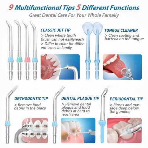 Ellesye Water Flosser is an easier and more effective alternative to string floss. It comes with 9 multifunctional tips, including 4 Classic Jet Tips, 2 Tongue Cleaner, 1 Dental Plaque Tip, 1 Orthodontic Tip and 1 Periodontal Tip – Perfect for anyone with braces, implants, crowns, bridges, or periodontal pockets, and can be shared with your whole family hygienically.
