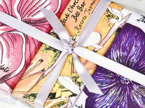A stunning gift for fans of delicious chocolate with a difference, Rococo’s set of three Floral bee chocolate bars are flavoured with jasmine, rose and violet. What makes these bee bars exceptional is the perfume grade essential oils and fragrances which complement the dark chocolate without overpowering it. Made with 65% cocoa solids, the blend includes cocoa beans from the Grococo project in northern Grenada. The wrappers are original watercolours by Rococo’s founder and designer Chantal Coady, the violet and rose designs are the original mould motifs, hand coloured.