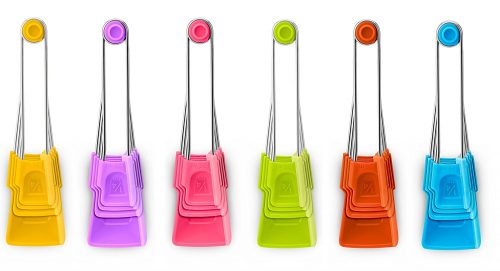 It has a flat squeegee tip and flexible scraping sides which make it awesome for scraping every last bit out of a jar or container. When you put it down its head sits up without creating a mess on the counter so it’s great for serving dips and tapas too.