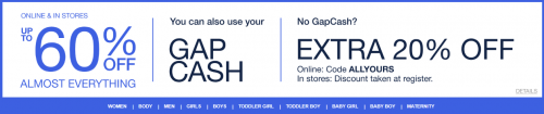 Gap Factory, also known as Gap Outlet, is offering 60% off almost everything right now. Plus you can get an additional 20% off with code ALLYOURS. Shop fashion for men, women, kids and toddlers!
