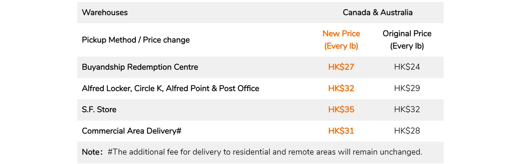 Due to the continuous impact on the operating costs, we will adjust the fee charged in shipments from Canada and Australia to Hong Kong to maintain the service quality.