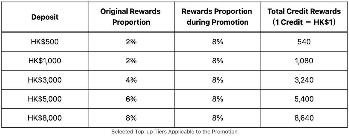 .You can pre-purchase credits up to HK$8,000 each time while the minimum amount is HK$500.
