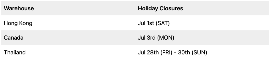 Due to local public holidays in different countries, some of our warehouses will be closed for a few days in July. Please note that our warehouses will not receive or send out parcels, nor will our warehouses update any shipment status during the closure.