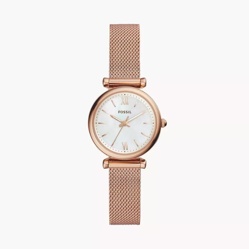 Wearing a watch can elevate your look and make you feel more confident! This 28mm Carlie features a mother-of-pearl dial with Roman numerals, three-hand movement and stainless steel rose gold-tone mesh bracelet.