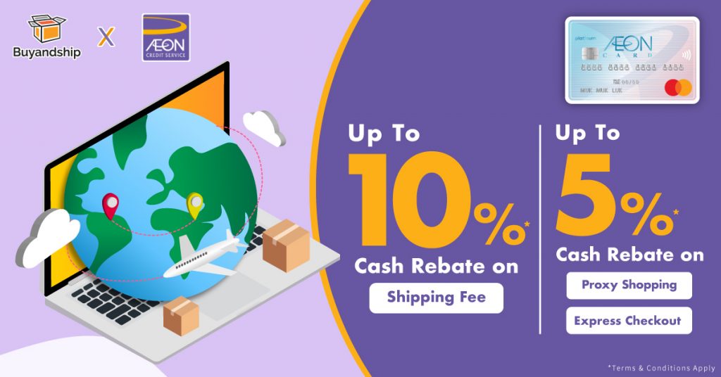 Upon successful registration for the “Buyandship Special Privilege” Promotion on the “AEON HK” Mobile App, enjoy 10% Cash Rebate when you use AEON Card to pay shipping fee, and enjoy 5% Cash Rebate on Proxy Shopping, or Express Checkout* on Buyandship Hong Kong website/mobile app or selected redemption centres^.