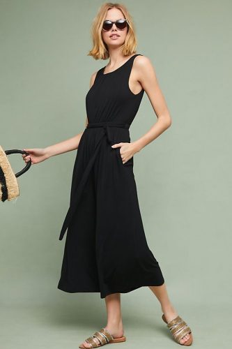 Did you know black goes with anything? A black slip on Jumpsuit by Anthropologie creates a striking look that goes beyond a simple dress or two-piece combo, this all-in-one wonder can be dressed up with heels and a clutch, or if you’re going to a more casual look, pair it with sneakers!